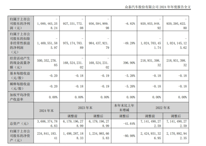 众泰汽车披露2024年度财务数据显示,全年实现营业收入5.58亿元,较上年同期下降23.96%。其中利润总额录得-10.03亿元,亏损幅度同比扩大5.35%;归属于上市公司股东的净亏损达10.00亿元,同比增亏6.82%。