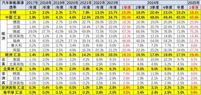 据行业权威统计,2025年1-3月全球汽车市场总销量达2264万辆,其中新能源汽车贡献446万辆,市场渗透率稳定在19.7%。细分技术路线中,纯电动车型以12.9%的市场份额保持主导地位,插电混动(6.8%)与油电混动(7%)共同构成混合动力技术阵营,整体呈现多元化发展态势。