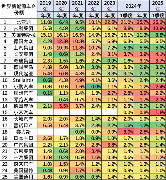 从全球市场份额演变看,中国新能源乘用车自2020年实现突破后持续扩大优势:2021年52.4%、2022年63%、2023年64%,至2024年突破七成关口(70.1%)。2025年一季度虽回落至67.7%,仍较去年同期提升5.4个百分点。纯电动领域,中国市场份额经历2019-2020年短暂回调后,2025年一季度回升至62.9%,同比提升4.1个百分点。